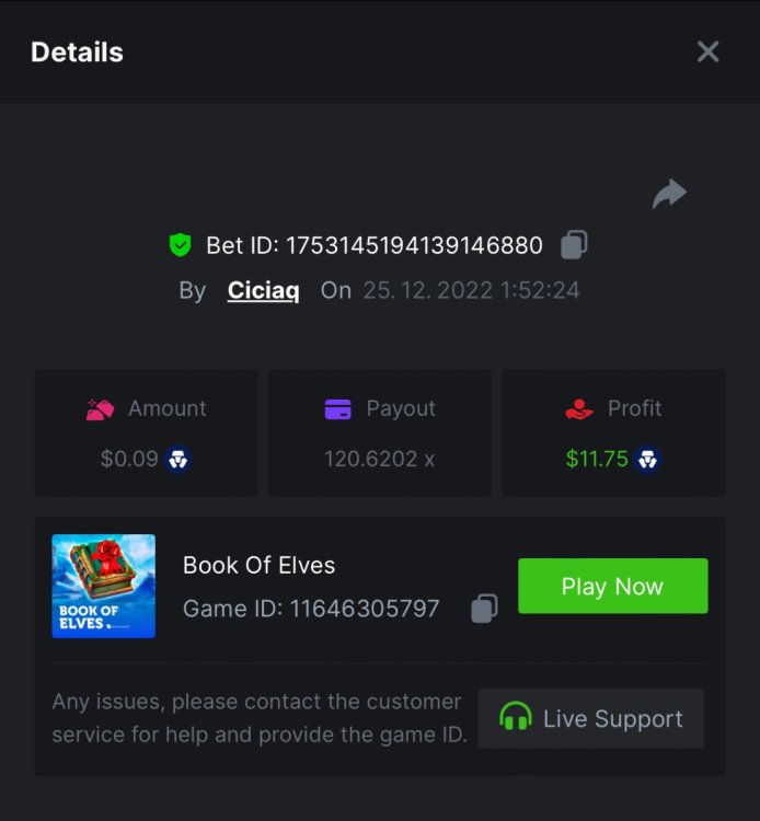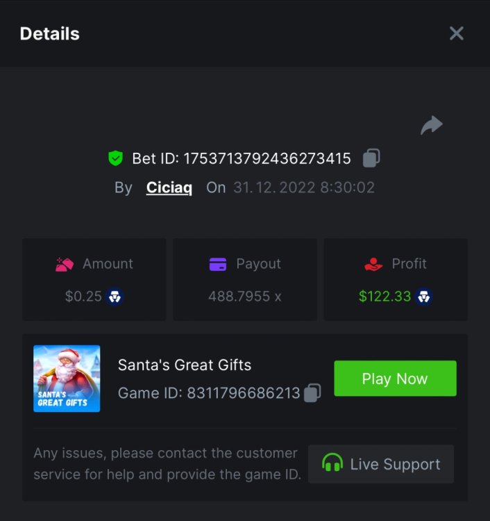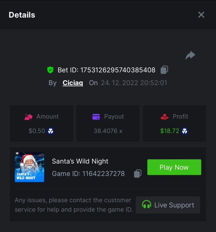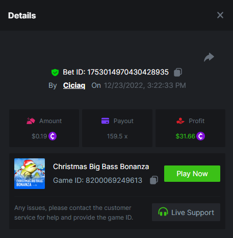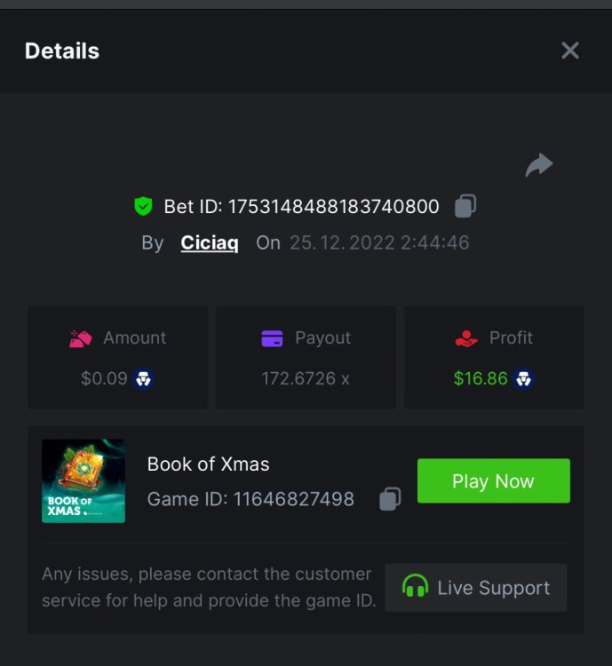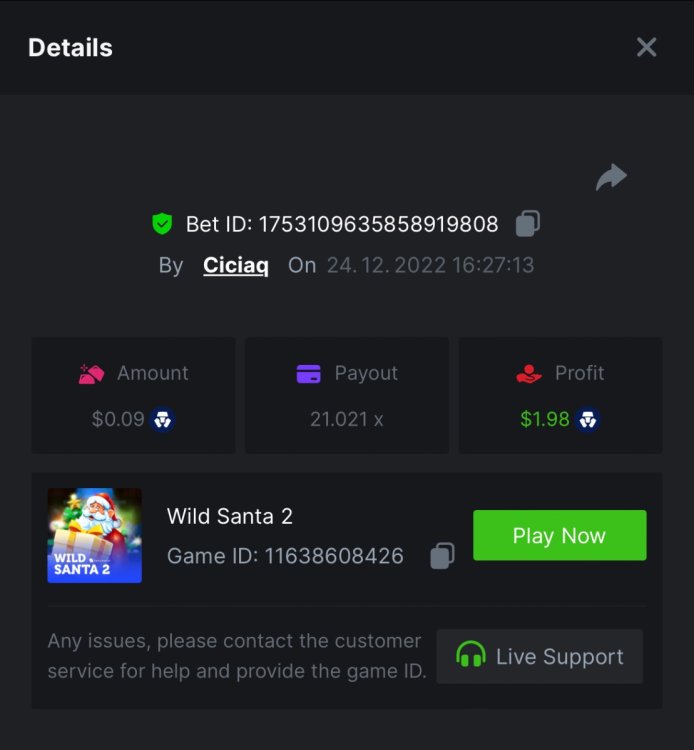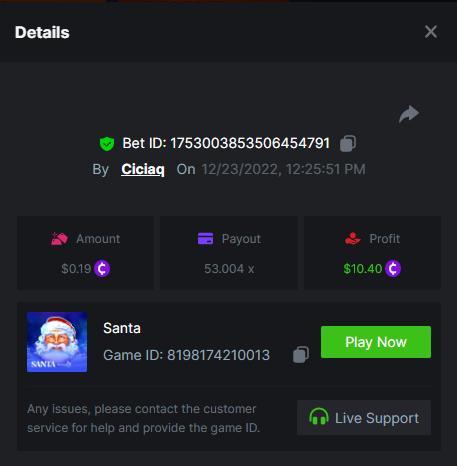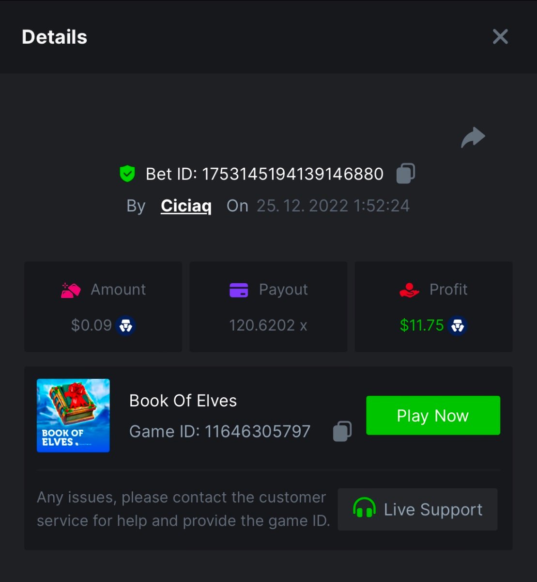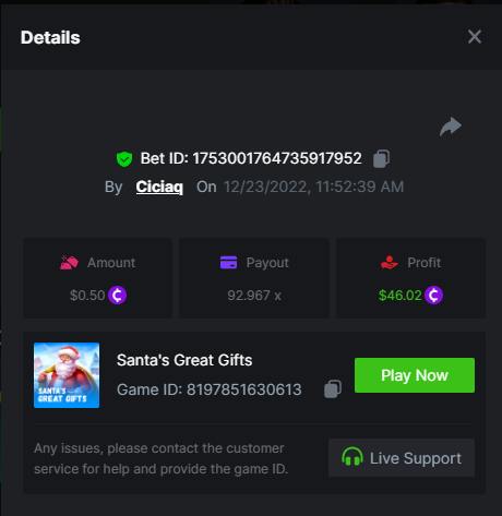 14. Book of Elves - 120.62x - https://bc.game/#/sd/10ZYH8DLGT55W3 Book of Xmas - 172.67x - https://bc.game/#/sd/10ZYKF4BSFYQS3 Wild Santa II - 21.02x - https://bc.game/#/sd/10ZXHYK4CVZGNN Santa’s Wild Night - 38.41x - https://bc.game/#/sd/10ZXYD8RFBZ5SJ