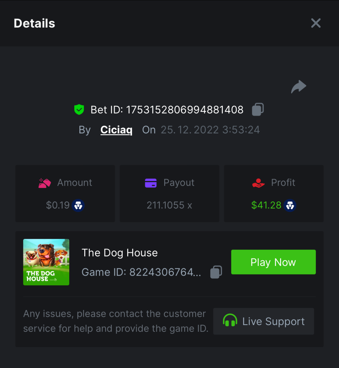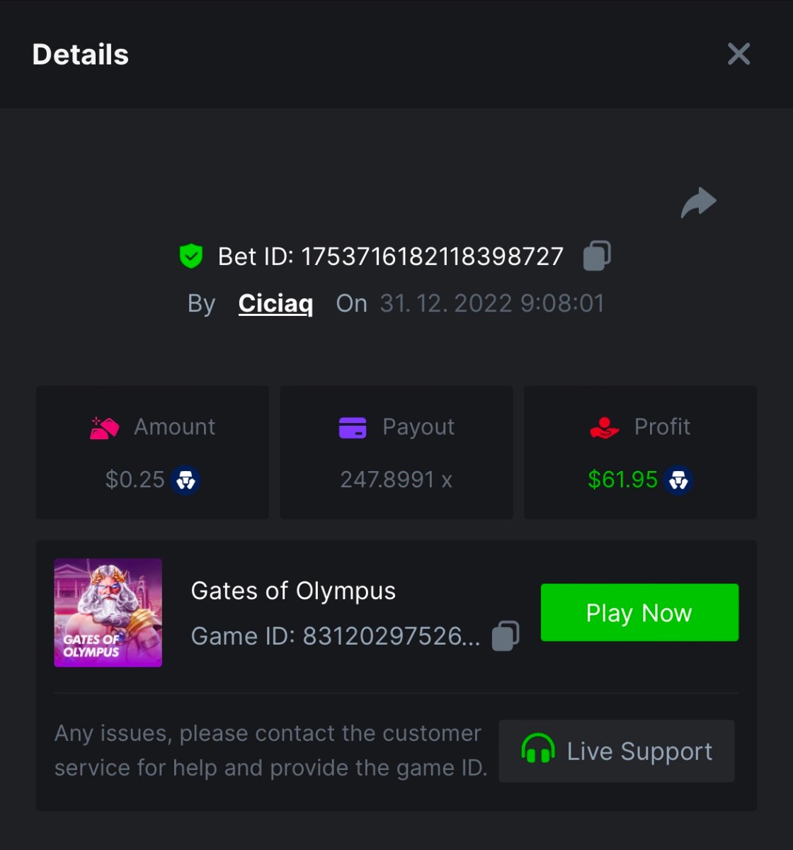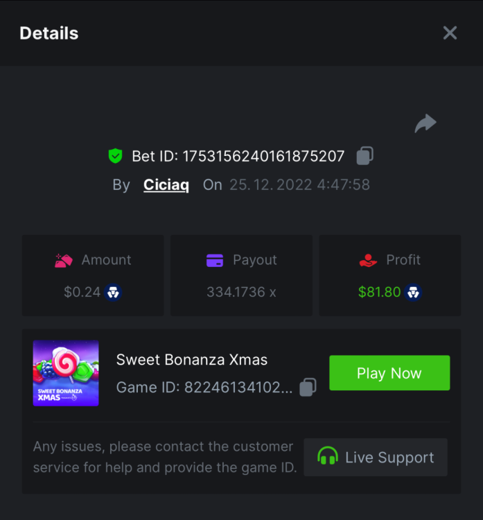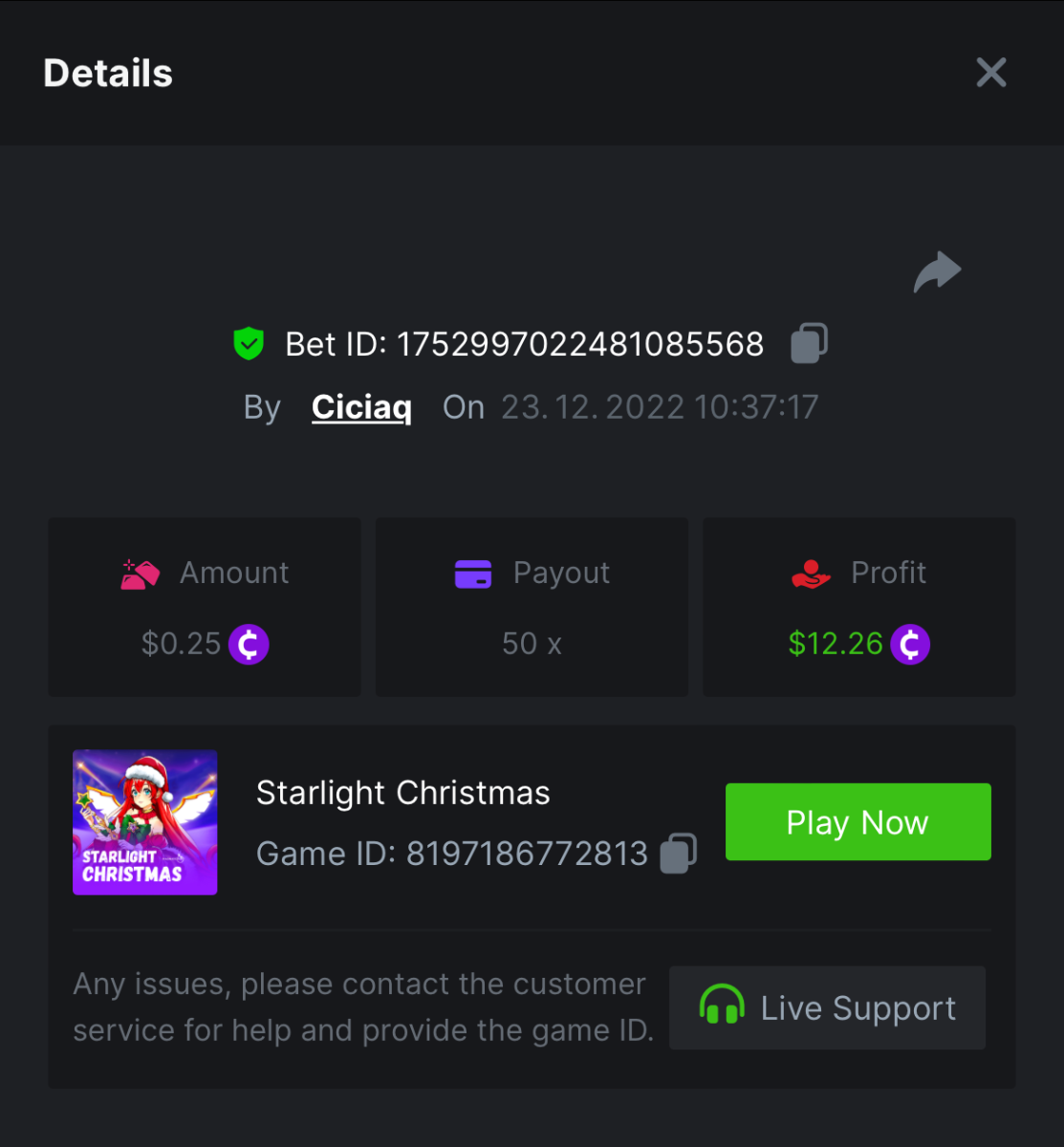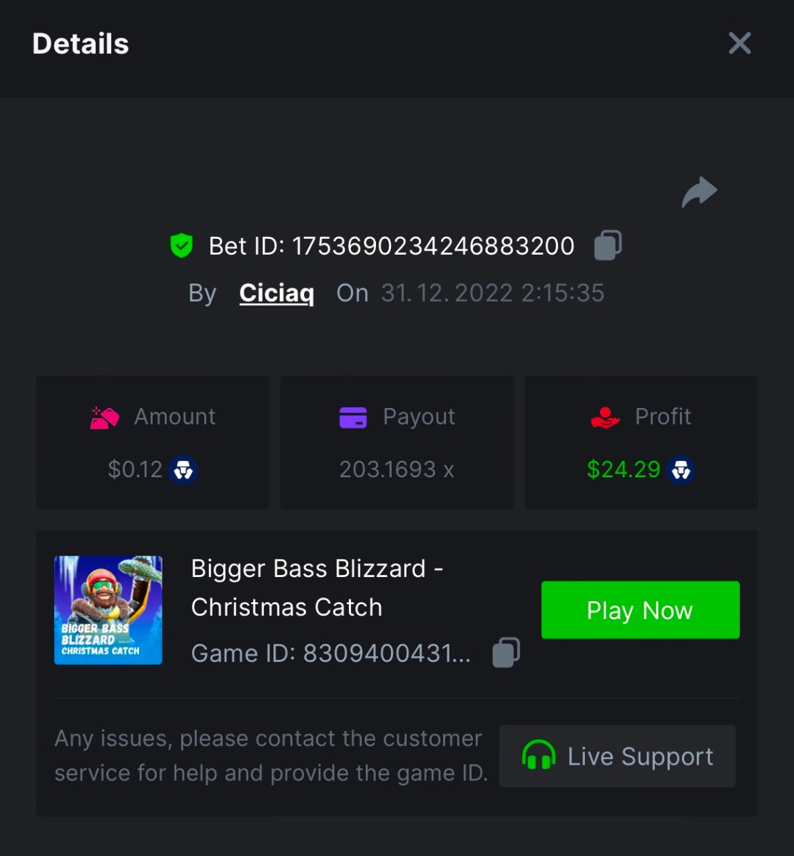 14. Book of Elves - 120.62x - https://bc.game/#/sd/10ZYH8DLGT55W3 Book of Xmas - 172.67x - https://bc.game/#/sd/10ZYKF4BSFYQS3 Wild Santa II - 21.02x - https://bc.game/#/sd/10ZXHYK4CVZGNN Santa’s Wild Night - 38.41x - https://bc.game/#/sd/10ZXYD8RFBZ5SJ