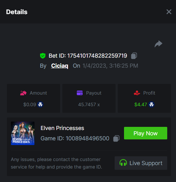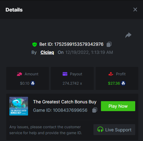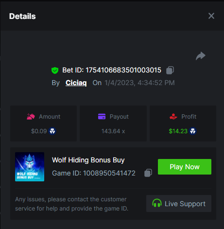 12. Wolf hiding bonus buy - 143.64x https://bc.game/#/sd/110ORR7MEZ3GUR Elven Princesses - 45.75x https://bc.game/#/sd/110OMVCRMYPBTF Mega Greatest Catch - 100x https://bc.game/#/sd/110OC2PEI3JR4J Cycle Of Luck - 71.07x https://bc.game/#/sd/110OMXKPD9LLOZ Collapsed Castle - 100.1x https://bc.game/#/sd/110NL8OBHCZDHV