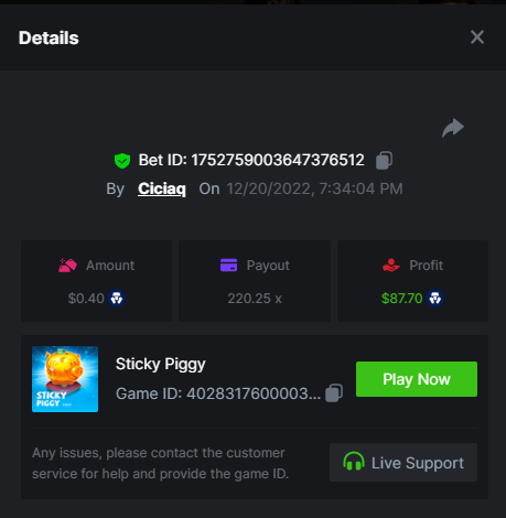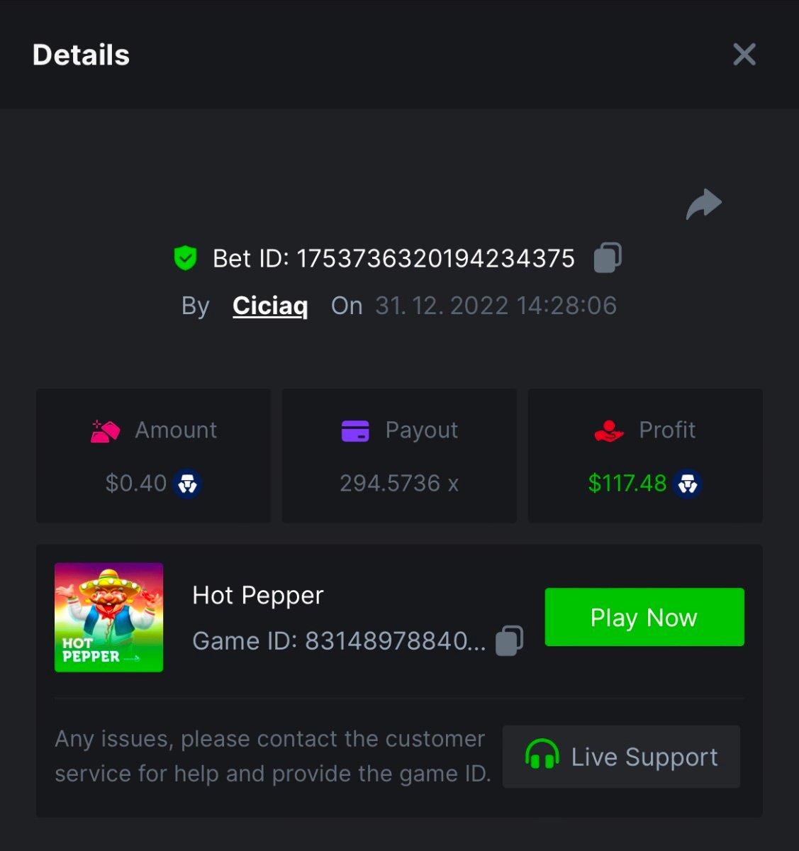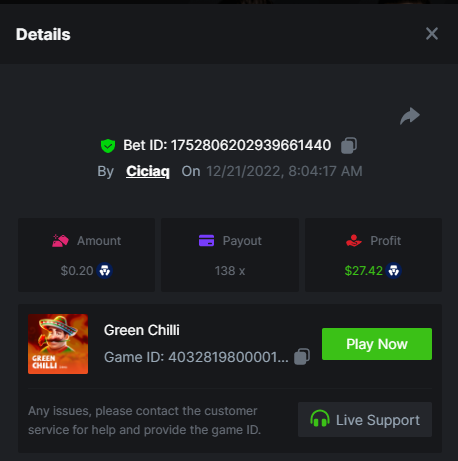 18. Aztec Fire - 180.95x https://bc.game/#/sd/10ZQ86YI56HFDF Sun of Egypt 3 - 95x https://bc.game/#/sd/10ZMOPVL148X77 Sticky Piggy - 220.25x https://bc.game/#/sd/10ZNWQJ1OELQ8J Big Heist - 392x https://bc.game/#/sd/10ZLSZEBAY239V Green Chilli - 138x https://bc.game/#/sd/10ZP76MH4GKO43