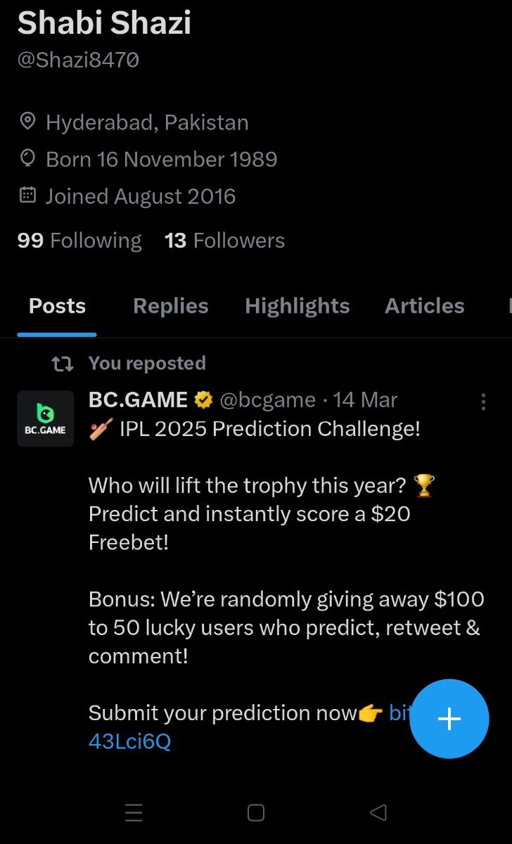 1. Easy 1 dipost 51 usdt 2 Plinko https://bcgame-bcallmain-mirror2.com/game-detail/1827694363951312673 3 crash https://bc.game/game-detail/1827788511214812292 7 Easy limbo 20X https://bcgame.im/game-detail/1827790856629415714 Easy Task Instagram https://www.instagram.com/shahbaz0334?igsh=cm00MXRvcGo4YW53 Easy Twitter https://x.com/Shazi8470?t=zAEczglPJkELLGCsksDu_Q&s=09 Easy Like and Retweet BC.GAME's latest post and tag at least 3 of your friend User name: @Shazi8470 Easy fallowing Facebook https://www.facebook.com/share/16KvtVoBuq/
