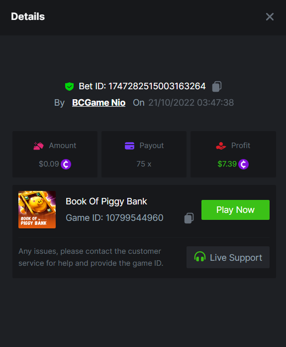 $1,500 Weekend Multiplier Battle Greetings players! We're pleased to announce a new weekend-long tournament with the Spinomenal provider. The tournament will take place from October 21 at 1:30 pm GMT until October 24, at 1:30 pm GMT. There are a total of 2 slots, in which the ranking is built based on the highest possible multipliers. The fun doesn't stop there, all eligible participants will be awarded and will enjoy their prizes shortly. Don't miss out on this thrilling battle! (More details below). Duration: 21/10/2022 1:30pm – 24/10/2022 1:30pm UTC Prize Pool: $1,500 Eligible Games: Play below games to participate in this event: Book of Piggy Bank Story of The Samurai - The Last Ronin The highest multiplier reached in each game will be added together and counted as total points. Bonus buys are allowed. If the player submits multiple winning entries for the same game, the entry with the highest multiplier will be valid. Minimum VIP Tier Must be VIP04 or higher in order to enter this event. Minimum Payout Minimum payout to qualify is 10x (in any game) for a valid entry. Minimum Bet Size Book of Piggy Bank - $0.10 Story of The Samurai - The Last Ronin - $0.25 Eligible Coins All cryptocurrencies are eligible (excepting JB, and BCL). Free Play Mode is not valid for this event. Prize Pool & Reward Breakdown The winners will win a share of the prize pool based on the detailed ranking below. All other participants who complete all minimum requirements will receive a 35% share of the prize pool. How to Enter Access the game to select your Bet ID, click on the Share icon (↷) and then Copy link. Return to the topic, paste the link in the field "Reply to this topic..." E.g.: https://bc.game/#/sd/10VI4C5YU35NV7 In the same post, upload a screenshot of your win by clicking the game ID WITH VIEW IN USD mode ENABLED (accessible at the bottom of dropdown menu for your wallet up top, and Submit Reply. Done! This way, we can ensure that your bet indeed met the minimum requirement at the time of placing it: https://bc.game/#/sd/10VI4C5YU35NV7 Additional Rules: Please combine all of your hits together in a SINGLE post. Edit your existing post for additional hits, don't create a new post. Each eligible entry must have the Bet Slip URL, failure to include it will disqualify participation in the event. Bet Slip image is not mandatory. Bets must be posted within 24 hours of placing bet in order to keep things fair for everyone. Bets must be made during the specified time window stated above. This thread will lock automatically when the time period is over. One (1) entry per household. Anyone found attempting to win multiple prizes will be disqualified from this challenge as well as all future challenges. Failure to follow instructions will result in your submission being null and void. By entering this challenge, you acknowledge that BC.Game has the final decision on results and placement. Payouts will be distributed after the event is finished. Please note that it could take anywhere between 24 hours to 7 days after the completion of the event.
