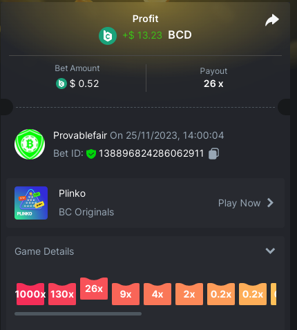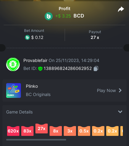 5. 20x - bet amount:0.32$ - Bet id: 9994389253566 - Bet link: https://bc.game/#/sd/11P1R1UXL5GQ4N