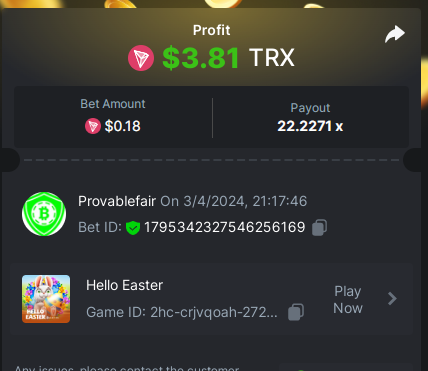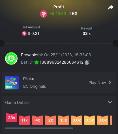 15. 22x 0.15$ - https://bc.game/#/sd/11FOS8Q84IM9YB - Bet ID: 124823577961693305 33x 0.15$ - https://bc.game/#/sd/11FOSULG15JLT3 - Bet ID: 124823577961693420 44x 0.15$ - https://bc.game/#/sd/11FOTZOPD4ZD8R - Bet ID: 124823577961694600