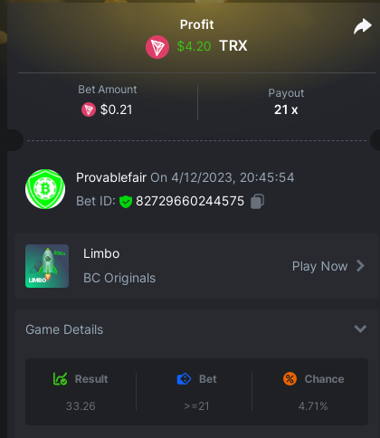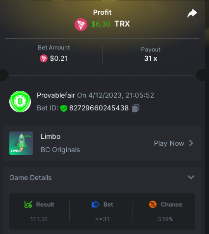 4. bet 0.21$ - 50x - Hash Dice - https://bc.game/#/sd/11QN6R5L1JDVQJ - Bet ID: 124823577961695244 bet 0.21$ - 50x - Limbo - https://bc.game/#/sd/11QN8527NJ49ZV - Bet ID: 82729660290963