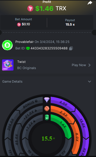 3. 0.4$ - 15.5x - https://bc.game/#/sd/11RH591NALD6X7 - Bet ID: 362640847763670359