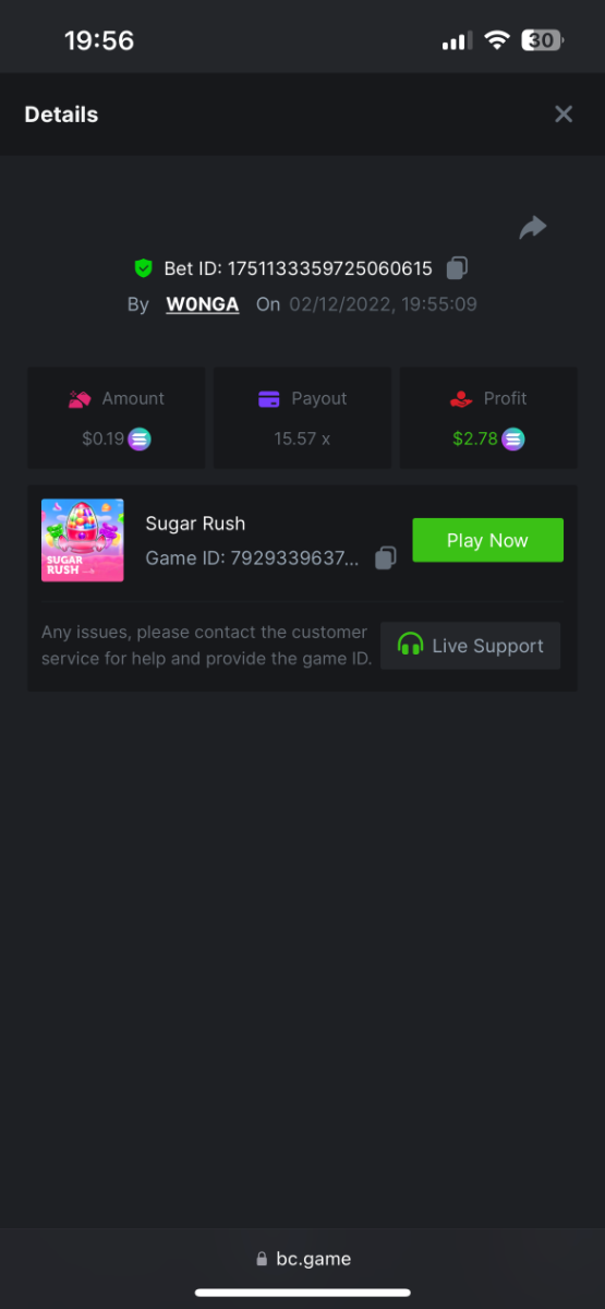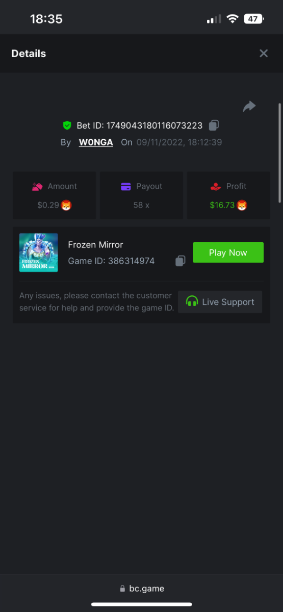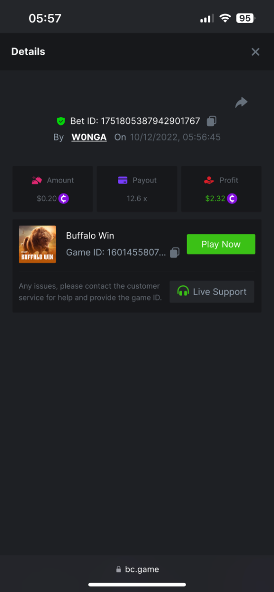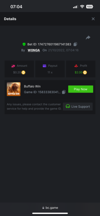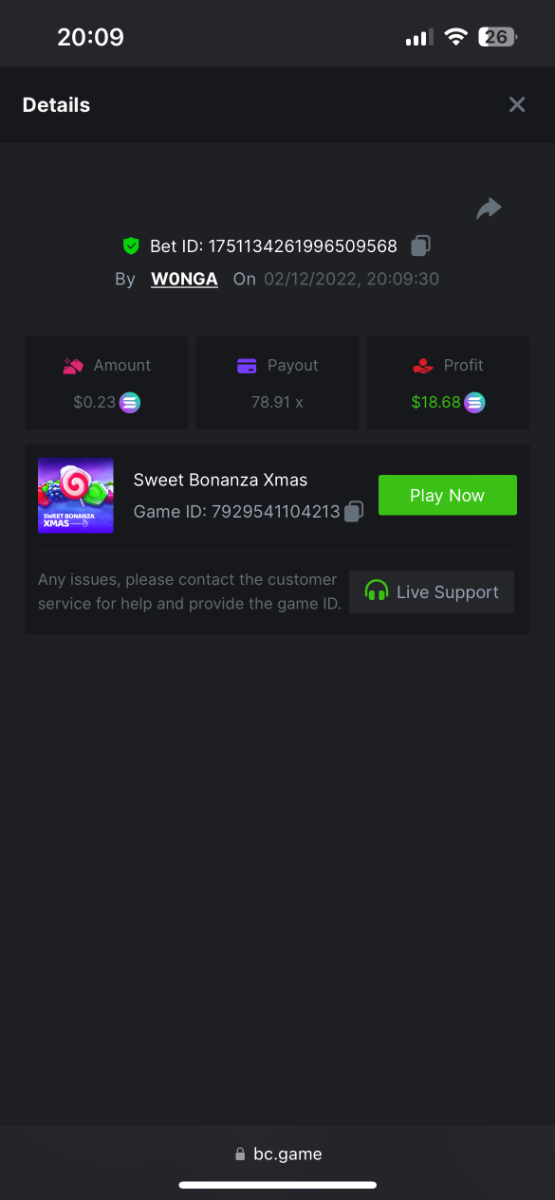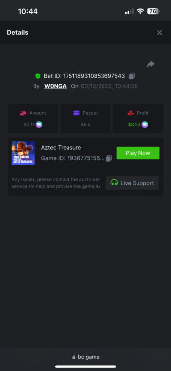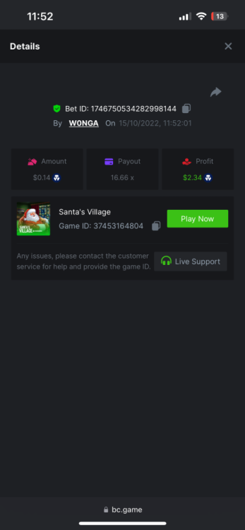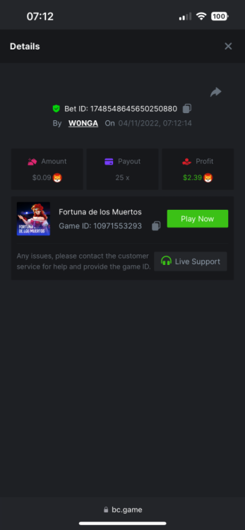 5. https://bc.game/#/sd/10YFF23M9VN76B This was a clean 50x win on $0.10! But the the dollar conversion says different. https://bcgame-dk2.pragmaticplay.net/gs2c/lastGameHistory.do?symbol=vs10bbbonanza&mgckey=AUTHTOKEN@11cc628b718a1c586678b11736e84ea3dfa730c7917478308de6e25bef028d13~stylename@bcgame_bcgame~SESSION@23942c19-4f81-4335-ac9a-6cefff7f9a75~SN@192ffaf4&tz=-00%3A00&mgckey=AUTHTOKEN@11cc628b718a1c586678b11736e84ea3dfa730c7917478308de6e25bef028d13~stylename@bcgame_bcgame~SESSION@23942c19-4f81-4335-ac9a-6cefff7f9a75~SN@192ffaf4 https://bc.game/#/sd/10YFG753VMQS5V https://bc.game/#/sd/10YFGJAIT2RMS3 https://bc.game/#/sd/10YFGXMC5YV8K3 https://bc.game/#/sd/10YGZ4VK6RWOIB