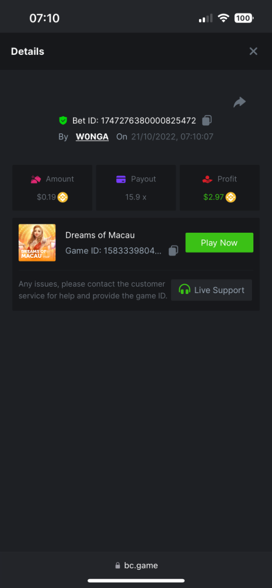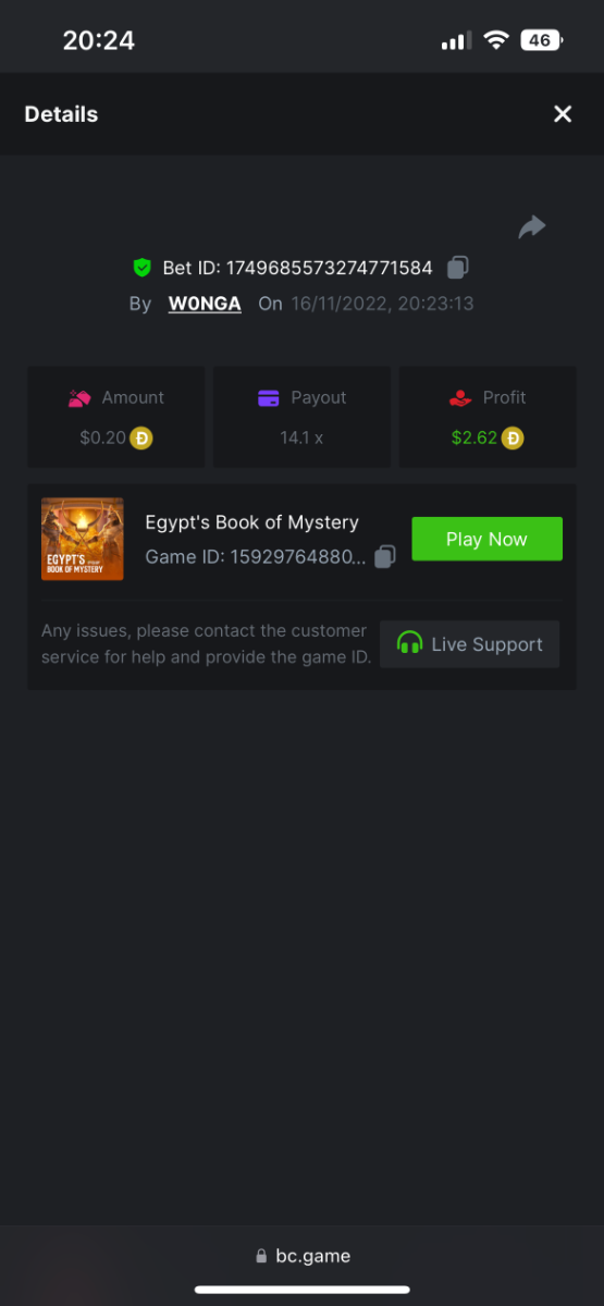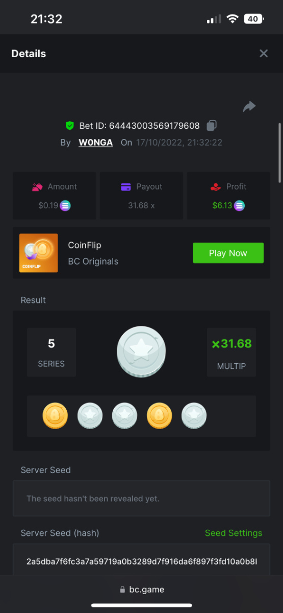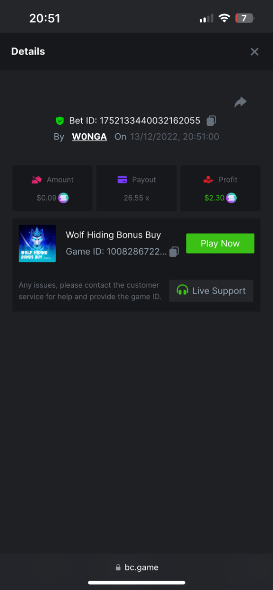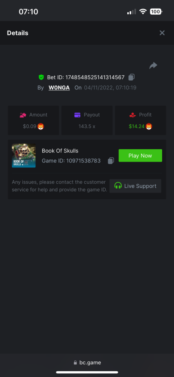 5. https://bc.game/#/sd/10YFF23M9VN76B This was a clean 50x win on $0.10! But the the dollar conversion says different. https://bcgame-dk2.pragmaticplay.net/gs2c/lastGameHistory.do?symbol=vs10bbbonanza&mgckey=AUTHTOKEN@11cc628b718a1c586678b11736e84ea3dfa730c7917478308de6e25bef028d13~stylename@bcgame_bcgame~SESSION@23942c19-4f81-4335-ac9a-6cefff7f9a75~SN@192ffaf4&tz=-00%3A00&mgckey=AUTHTOKEN@11cc628b718a1c586678b11736e84ea3dfa730c7917478308de6e25bef028d13~stylename@bcgame_bcgame~SESSION@23942c19-4f81-4335-ac9a-6cefff7f9a75~SN@192ffaf4 https://bc.game/#/sd/10YFG753VMQS5V https://bc.game/#/sd/10YFGJAIT2RMS3 https://bc.game/#/sd/10YFGXMC5YV8K3 https://bc.game/#/sd/10YGZ4VK6RWOIB