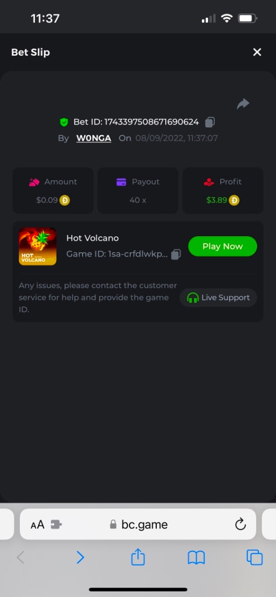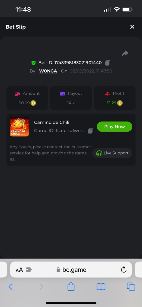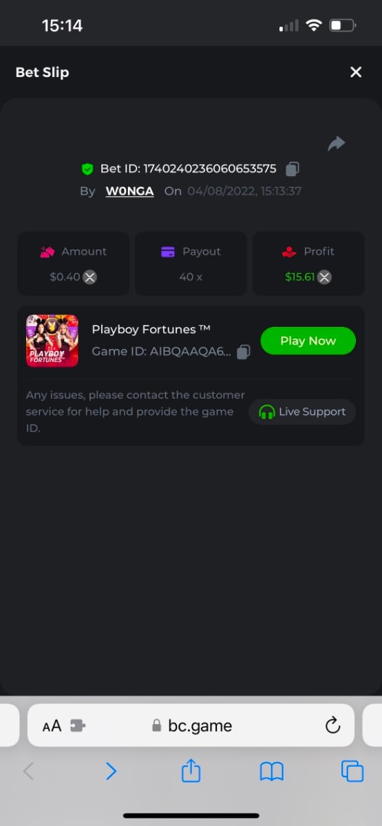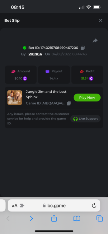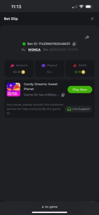 https://bc.game/#/sd/10YFF23M9VN76B This was a clean 50x win on $0.10! But the the dollar conversion says different. https://bcgame-dk2.pragmaticplay.net/gs2c/lastGameHistory.do?symbol=vs10bbbonanza&mgckey=AUTHTOKEN@11cc628b718a1c586678b11736e84ea3dfa730c7917478308de6e25bef028d13~stylename@bcgame_bcgame~SESSION@23942c19-4f81-4335-ac9a-6cefff7f9a75~SN@192ffaf4&tz=-00%3A00&mgckey=AUTHTOKEN@11cc628b718a1c586678b11736e84ea3dfa730c7917478308de6e25bef028d13~stylename@bcgame_bcgame~SESSION@23942c19-4f81-4335-ac9a-6cefff7f9a75~SN@192ffaf4 https://bc.game/#/sd/10YFG753VMQS5V https://bc.game/#/sd/10YFGJAIT2RMS3 https://bc.game/#/sd/10YFGXMC5YV8K3 https://bc.game/#/sd/10YGZ4VK6RWOIB -