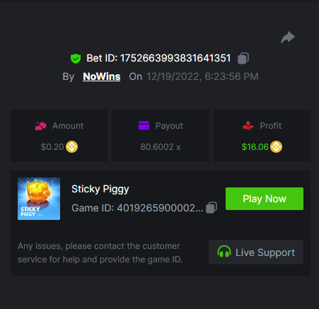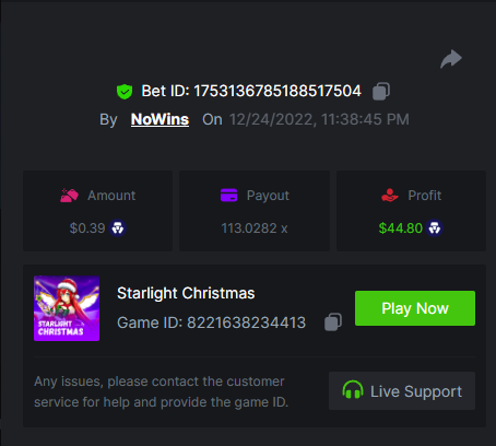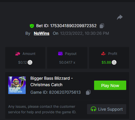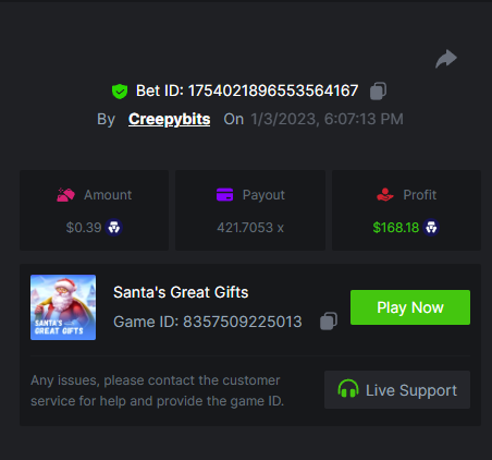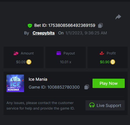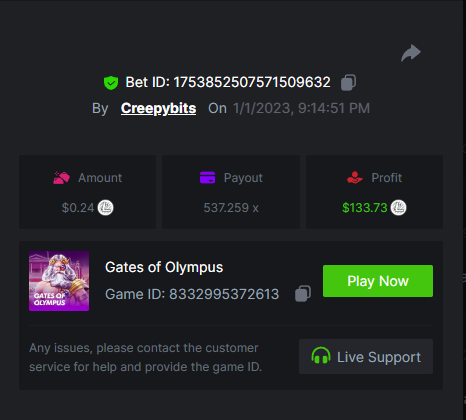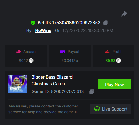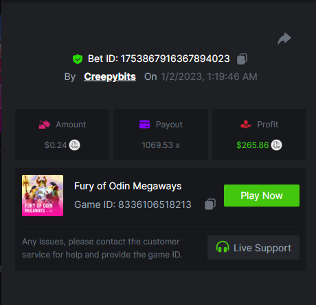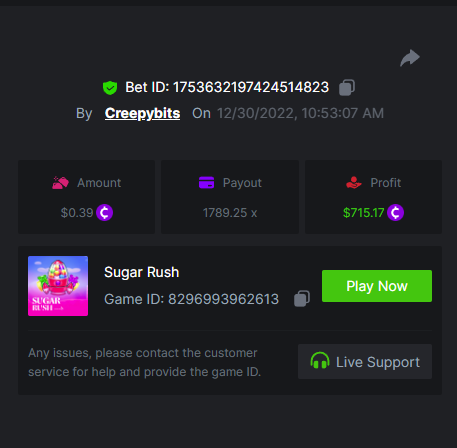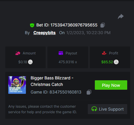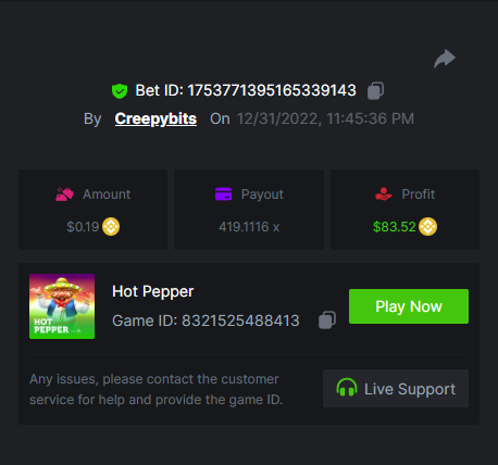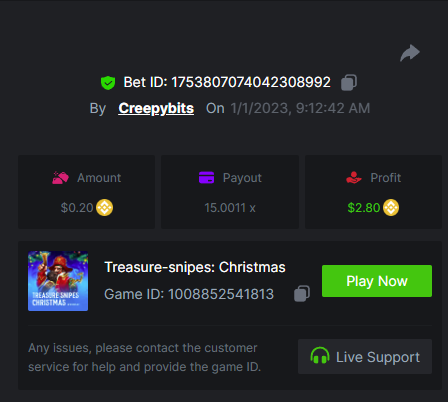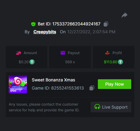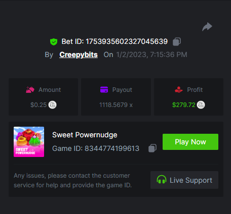 9. So many games to keep track of these days. This is just preliminary, and for my own sake to see what I've done Sugar rush - 1789.25x Gates of Olympus - 537.25x Sweet bonanza - 879.99x Madame Destiny Megaways - 592.75x Starlight Princess - 1258.31x Santa’s Great Gifts - 421.70x Bigger Bass Blizzard - Christmas Catch - 475.93x Pizza! pizza? pizza! - 600.03x Sweet powernudge - 1118.56x Hot pepper - 419.11x Fury of Odin megaways - 1069.53x Super joker - 189.97x https://bc.game/#/sd/110MGAL2XS7LSJ https://bc.game/#/sd/110FLLJMTWFGUR https://bc.game/#/sd/110KEWRKP5Y9LF https://bc.game/#/sd/110BOIZ04T5DZN https://bc.game/#/sd/110BSJPWHB0AVN https://bc.game/#/sd/110M42STGBYYHF https://bc.game/#/sd/110MX5W6CNXVRN https://bc.game/#/sd/110HTIASYG4S2B https://bc.game/#/sd/110MAWMRYEXV6B https://bc.game/#/sd/110K3EY69MGWER https://bc.game/#/sd/110M2R1YE4WZYR https://bc.game/#/sd/110I8VYSQ5DKIB BOUNTY https://bc.game/#/sd/110BYHKFG8ETQR