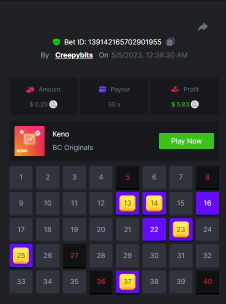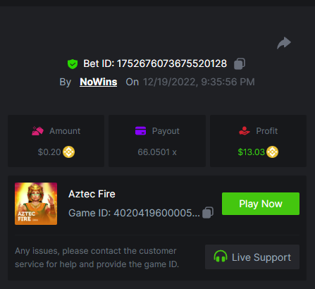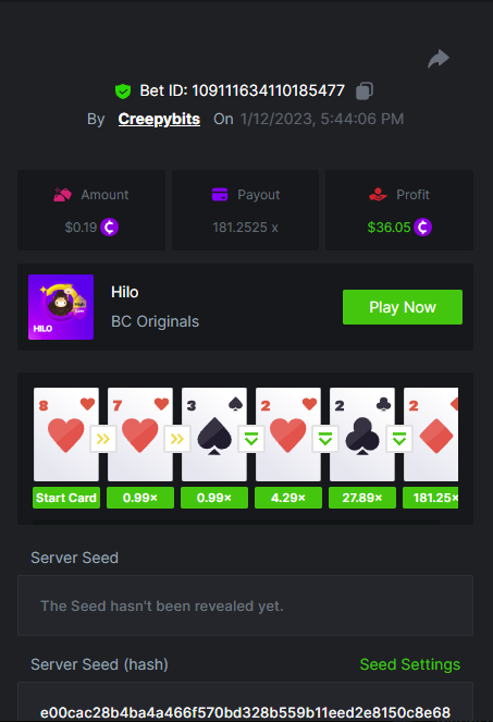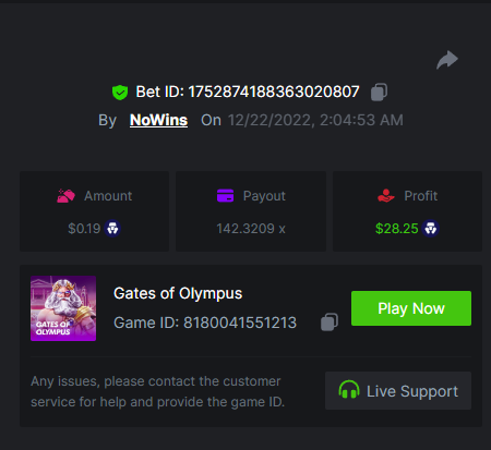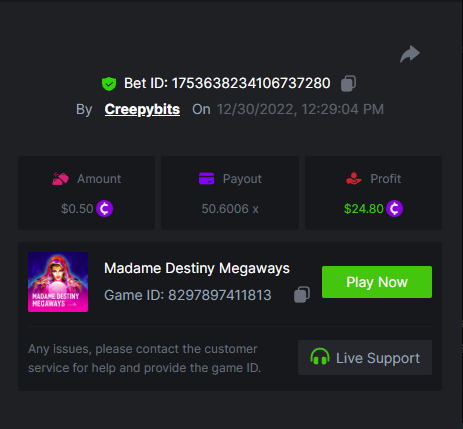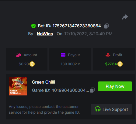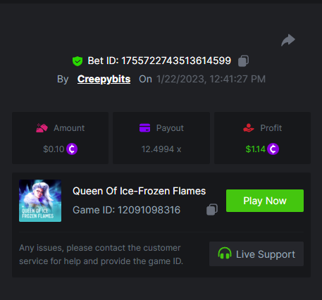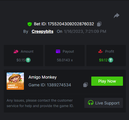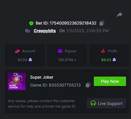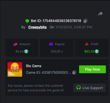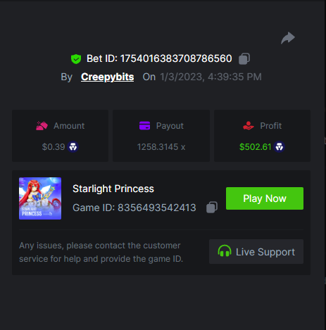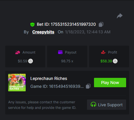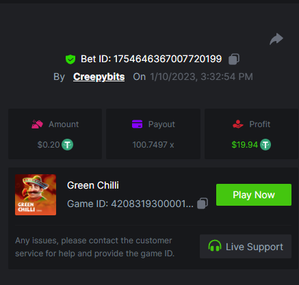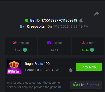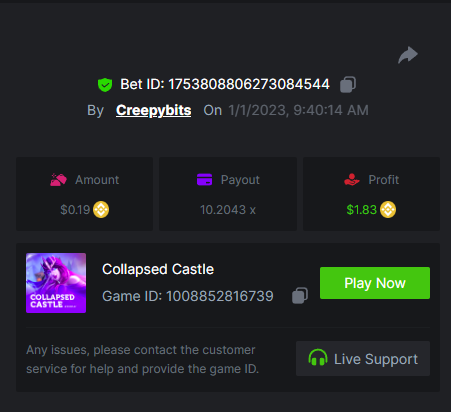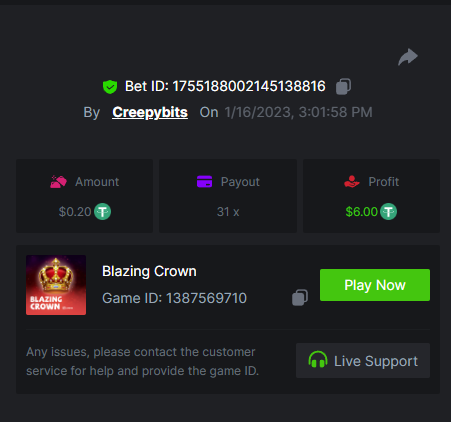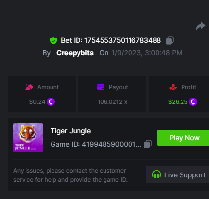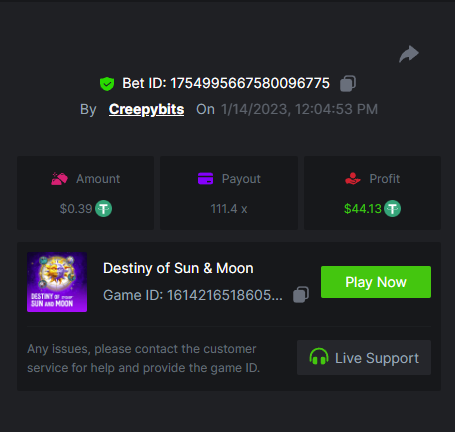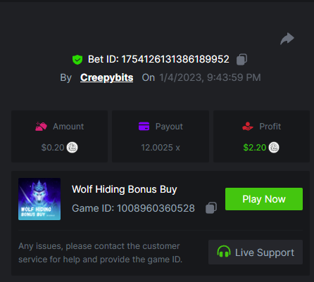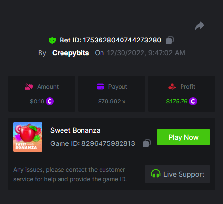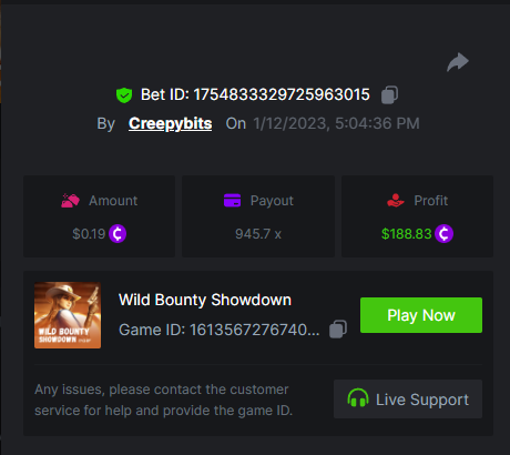 6. -- Just to keep track -- Wild Bounty Showdown - 945.7x Candy Bonanza - 102.4x Leprechaun Riches - 98.75x Spirited Wonders - 68.35x Butterfly Blossom - 135.44x Supermarket Spree - 152.25x Wild Bandito - 207.2x Destiny of Sun and Moon - 111.4x Prosperity Fortune Tree - 210.15x Legendary Monkey King - 84.6x -- -- -- -- -- -- -- -- -- -- -- -- https://bc.game/#/sd/111MI4BCN45A8J https://bc.game/#/sd/1118N98VQ6YOLV https://bc.game/#/sd/111FLN8H2KMUXF https://bc.game/#/sd/1117ZLODNLU13N https://bc.game/#/sd/111ASNM3GZTLOZ https://bc.game/#/sd/111E79UVO7INMB https://bc.game/#/sd/111D534T8YKE1F https://bc.game/#/sd/111ECYHMTQN09F https://bc.game/#/sd/111LTQM7BZ1TEB https://bc.game/#/sd/111D33QIXPOU1F BOUNTY