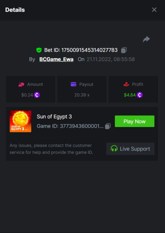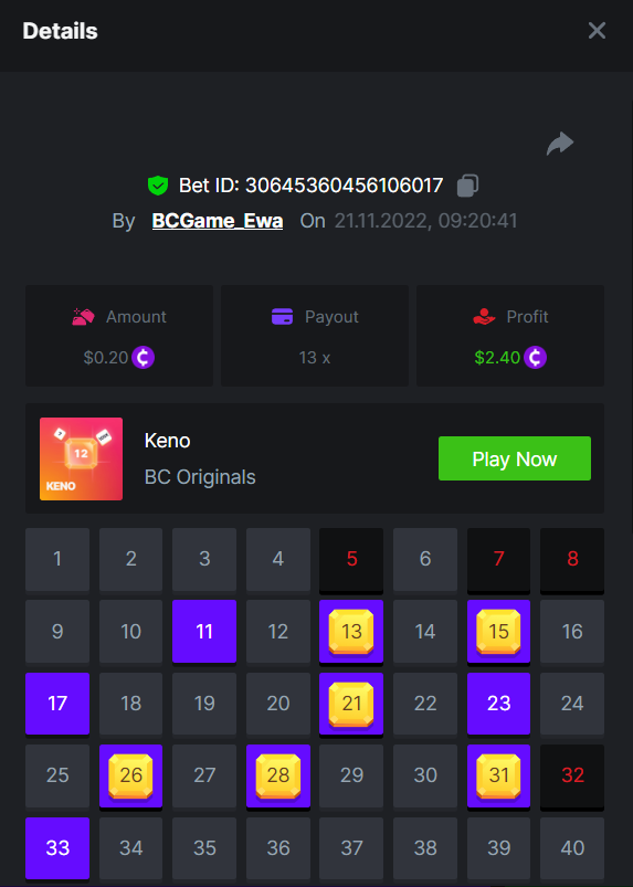 $2,500 Prestige Keno Multiplayer Challenge #56 Starts: 21, November 13:30pm GMT Ends: 28, November 13:30pm GMT Hey, hey, VIPs! We are giving away $2,500 in prizes from our Prestige challenge. The game we've selected is in-house Keno Single/Multiplayer, where the Top 10 will take home a major prize, and the remaining $700 will be split between all other players! Thinking that it's over? Calm down, any participant who completes the extra bounty will receive an equal share of 20% of the prize pool. So come join us and see if you can take home the grand prize! (Check out more details below). What's the Challenge? Complete as many of the following 19 payouts on either KENO or KENO Multiplayer. Must be a exact muliplier. | 11x | 17x | 26x | 30x | 56x | 63x | 81.5x | 100x | 180x | 250x | 270x | 350x | 450x | 500x | 600x | 710x | 800x | 900x | 1000x | Each payout you hit above counts as 1 point (Maximum 1 point for each payout). If there is a tie, the player with the higher average bet amount (in USD) shall be the winner. Minimum VIP There's no minimum VIP level Minimum Payouts Hit at least 3 payouts to qualify Minimum Bet Size $0.15 USD equivalent Eligible Coins All cryptocurrencies are eligible (excepting JB) Available Prizes 1st Place....... $500 2nd Place..... $300 3rd Place...... $200 4th Place......$100 5th Place......$50 6th-10th.........$30 All other participants.........$700 Bounty Prize...$500, equal share. EXTRA BOUNTY Share a bet with multiplayer 500x or higher from the list hit on Keno within the timeframe of this challenge and you will receive a share of 20% of the prize pool! Original rules apply with a minimum bet, minimum payout & VIP. How to Enter To enter, copy the link of the bet you'd like to submit. Once you've copied it, paste it as a reply to this thread like so: Link: https://bc.game/#/sd/10XMZRBO6GCDG3 In the same post, upload a screenshot of your win by clicking the game ID WITH VIEW IN USD mode ENABLED (accessible at the bottom of dropdown menu for your wallet up top. This way, we can ensure that your bet indeed met the minimum requirement at the time of placing it: Link: https://bc.game/#/sd/10XMZRBO6GCDG3 Please combine all of your hits together in a SINGLE post. Edit your existing post for additional hits, don't create a new post. Each eligible entry must have the Bet Slip URL, failure to include it will disqualify participation in the event. Bet Slip image is not mandatory. Bets must be posted within 24 hours of placing bet in order to keep things fair for everyone. Bets must be made during the specified time window stated above. This thread will lock automatically when the time period is over. One (1) entry per household. Anyone found attempting to win multiple prizes will be disqualified from this challenge as well as all future challenges. Failure to follow instructions will result in your submission being null and void. By entering this challenge, you acknowledge that BC.Game has the final decision on results and placement. Payouts will be made within 48 hours of challenge completion, please be patient, we promise you that we haven't forgotten. We check and double check to make sure the rightful winners receive their prize. Prizes will be paid out in BCD. Good luck everyone!