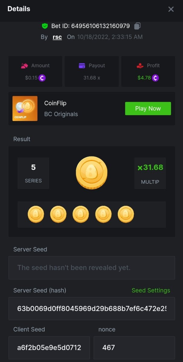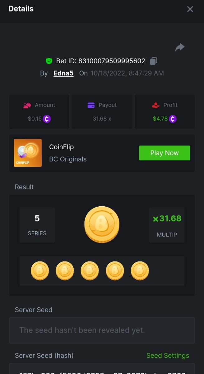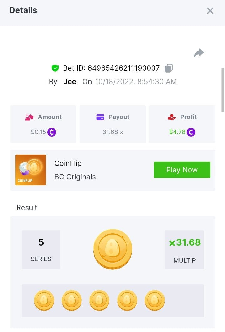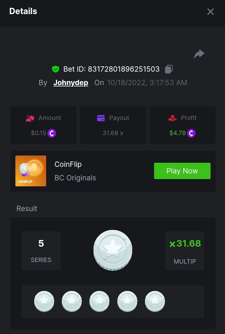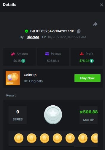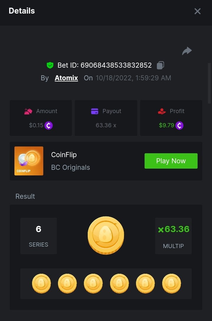 Event Team Niobium Posted October 17, 2022 Event Team Share Posted October 17, 2022 (edited) $2.5k Prestige Coinflip Challenge #51 Starts: 17, October 3:30pm GMTEnds: 24, October 3:30pm GMT Hey everyone! We're giving away $2,500 in prizes from our Prestige challenge. The game we've selected is in-house Coinflip, where the Top 10 will take home a major prize, and the remaining $700 will be split between all other participants. Additionally, any player who completes the extra bounty will receive an equal share of 20% of the prize pool. Heads or tails? Every day is a new chance to turn an normal day into a joyous event - (details further down). What's the Challenge? Win the highest multiplier you can on in-house Coinflip (Most flips in a row). If there is a tie, the player with the higher average bet amount (in USD) shall be the winner. If there is a tie in the amount and payout, the one who posted or edited his post first will be considered in the Ranking. Minimum VIP There's no minimum VIP level Minimum Payouts Minimum payout to qualify is 31.68x (5 Flips) Minimum Bet Size $0.15 USD equivalent Eligible Coins All cryptocurrencies are eligible (excepting JB) Available Prizes 1st Place....... $500 2nd Place..... $300 3rd Place...... $200 4th Place......$100 5th Place......$50 6th-10th.........$30 All other participants.........$700 Bounty Prize...$500, equal share. EXTRA BOUNTY Share a bet completing 9 Flips or more (Even losing a bet also counts), and receiving an equal share of the $500 prize pool! Original rules apply with all minimum requirements. E.g: Let's say someone completed 9 flips but lost on the 10th flip, the bet still counts as a reward. How to Enter To enter, copy the link of the bet you'd like to submit. Once you've copied it, paste it as a reply to this thread like so: Link: https://bc.game/#/sd/10V8P6Z205BBBN In the same post, upload a screenshot of your win by clicking the game ID WITH VIEW IN USD mode ENABLED (accessible at the bottom of dropdown menu for your wallet up top. This way, we can ensure that your bet indeed met the minimum requirement at the time of placing it: Link: https://bc.game/#/sd/10V8P6Z205BBBN Please combine all of your hits together in a SINGLE post. Edit your existing post for additional hits, don't create a new post. Each eligible entry must have the Bet Slip URL, failure to include it will disqualify participation in the event. Bet Slip image is not mandatory. Bets must be posted within 24 hours of placing bet in order to keep things fair for everyone. Bets must be made during the specified time window stated above. This thread will lock automatically when the time period is over. One (1) entry per household. Anyone found attempting to win multiple prizes will be disqualified from this challenge as well as all future challenges. Failure to follow instructions will result in your submission being null and void. By entering this challenge, you acknowledge that BC.Game has the final decision on results and placement. Payouts will be distributed after the event is finished. Please note that it could take anywhere between 24 hours to 7 days after the completion of the event. Good luck everyone! Edited October 17, 2022 by Niobium 4 Link to comment Share on other sites More sharing options...