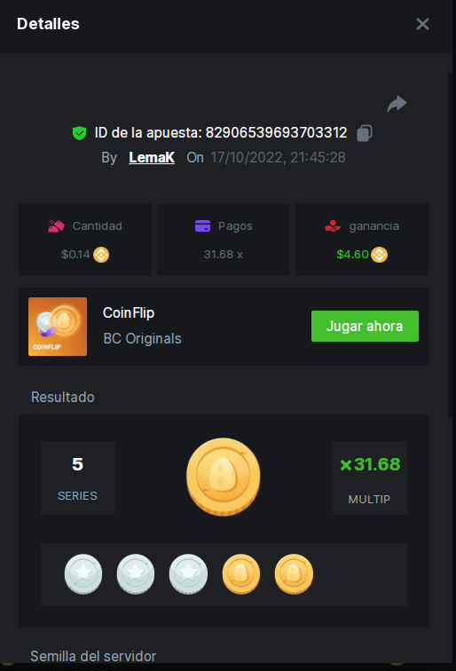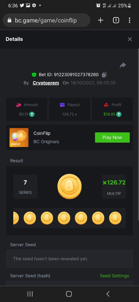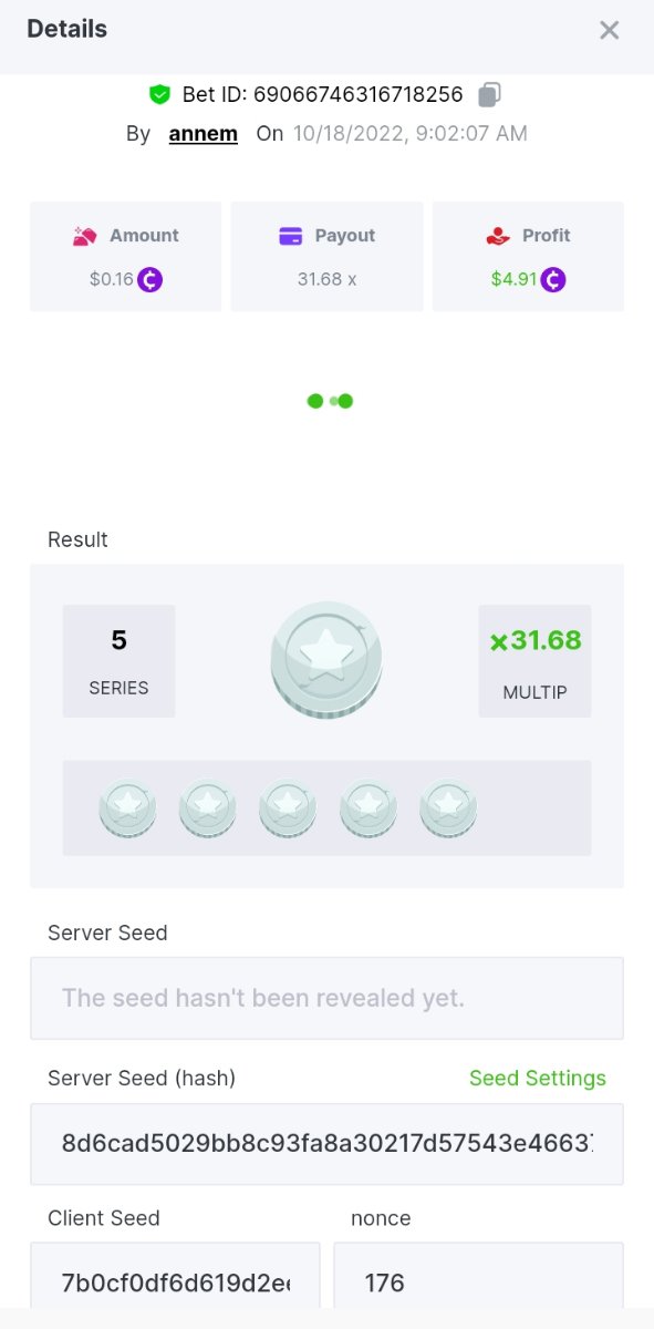 bassabar Posted October 17, 2022 Share Posted October 17, 2022 (edited) Highest multiplier: 2027.52x Bounty (9 flips or more): Yes Multiplier: 2027.52x (plus bounty) https://bc.game/#/sd/10VPXAWJRQMP03 Edited October 24, 2022 by bassabar 1 Link to comment Share on other sites More sharing options...