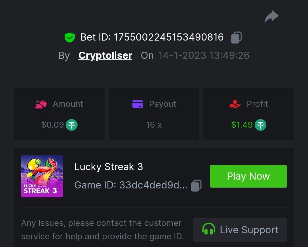 MeninaDtrap Posted January 14, 2023 Share Posted January 14, 2023 Lucky streak 3. https://hash.game/#/sd/111D9M6QMW69LF 150.30x $0.20 bet Machine 40 https://hash.game/#/sd/111DA3ADU08WLV 50x $0.40 bet Safari https://hash.game/#/sd/111EHI8CKWTNV7 611.92x $0.50 bet twerk https://hash.game/#/sd/111GK0MCCOOB9V 95.59x $0.20 bet chance machine 20 https://hash.game/#/sd/111IZXZUUSAAZ7 42.01x $0.40 bet Link to comment Share on other sites More sharing options...