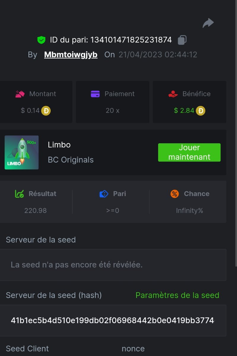 Member AkSyEn03 Posted April 16, 2023 Member Share Posted April 16, 2023 48$ Défi Prestige Limbo #84 DURÉE : 16 avril 10h40- 22 avril 14 h 30 Cette semaine, Prestige Challenge est de retour avec votre jeu préféré Limbo ! Participez à cet événement incroyable mais stimulant pour partager des prix d'une valeur de 48 $ ! Veuillez consulter ci-dessous le tout nouveau tableau de distribution de la cagnotte pour en savoir plus. Nous allons essayer cette nouvelle méthode pendant un certain temps et en fonction des participations et des retours, nous augmenterons encore nos cagnottes. Quel est le défi ? Gagnez le multiplicateur le plus élevé possible sur le jeu maison de BC.Game, Limbo. S'il y a égalité, le joueur avec le montant de pari moyen le plus élevé (en USD) sera le gagnant. S'il y a égalité dans le montant et le paiement, celui qui a publié ou modifié sa publication en premier sera considéré dans le classement. Rejoignez et faites un basebet d'au moins 0,15 vous pouvez rejoindre 2 événements en même temps événement régional événement forum et obtenez une double récompense !!! Comment entrer Pour participer, copiez le lien du pari que vous souhaitez soumettre. Une fois que vous l'avez copié, collez-le en réponse à ce fil comme suit : Lien : https://bc.game/#/sd/117K0971D8G8B7 Dans le même message, téléchargez une capture d'écran de votre gain en cliquant sur l'ID de jeu AVEC AFFICHAGE EN USD mode ACTIVÉ (accessible en bas du menu déroulant pour votre portefeuille en haut. De cette façon, nous pouvons nous assurer que votre pari a bien atteint l'exigence minimale au moment de le placer : -VIP minimal Il n'y a pas de niveau VIP minimum -Le paiement minimum pour se qualifier est de 20x Taille de mise minimale -L'équivalent de 0,003 USD Toutes les crypto-monnaies sont éligibles (sauf JB)Prix disponibles : 1er..............$15 2ème..........$10 3ème..........$5 4 à 13.........$2 CONDITIONS GÉNÉRALES : Veuillez combiner tous vos résultats dans un SEUL message. Modifiez votre publication existante pour des résultats supplémentaires, ne créez pas de nouvelle publication. Chaque inscription éligible doit avoir l'URL du bordereau de pari. Si vous ne l'incluez pas, la participation à l'événement sera disqualifiée. L'image du bulletin de pari n'est pas obligatoire. Les paris doivent être publiés dans les 24 heures suivant le placement du pari afin que les choses restent équitables pour tout le monde. Les paris doivent être faits pendant la fenêtre de temps spécifiée ci-dessus. Ce fil se verrouillera automatiquement lorsque la période de temps sera terminée. Une (1) participation par foyer. Toute personne surprise en train de tenter de gagner plusieurs prix sera disqualifiée de ce défi ainsi que de tous les défis futurs. Le non-respect des instructions entraînera la nullité de votre soumission. En participant à ce défi, vous reconnaissez que BC.Game a la décision finale sur les résultats et le placement. Les paiements seront distribués après la fin de l'événement. Veuillez noter que cela peut prendre entre 24 heures et 7 jours après la fin de l'événement. Link to comment Share on other sites More sharing options...