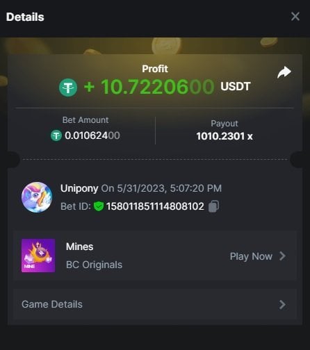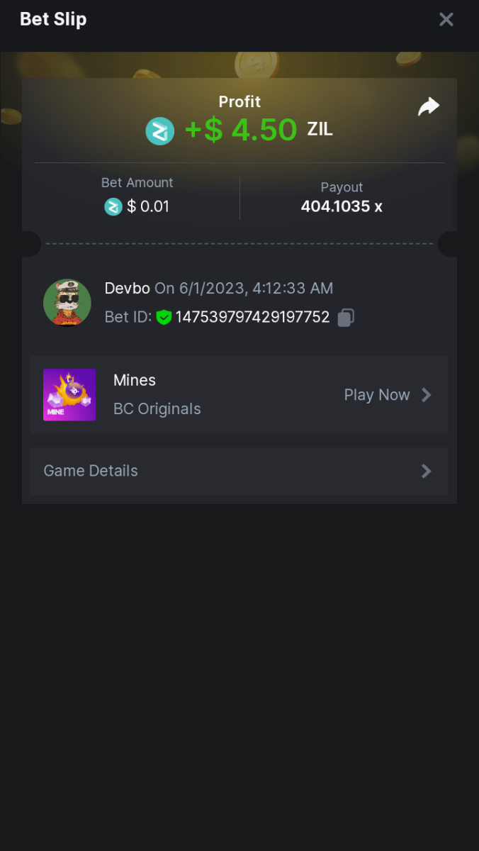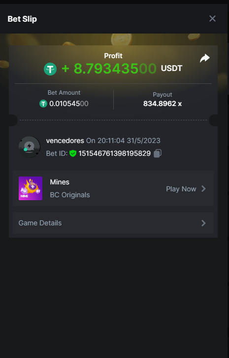 Maksypro Posted May 31, 2023 Share Posted May 31, 2023 Read Carefully Before Start To Hunt Daily Challenges #252 MINES Hunt : Win the highest multiplier Min Multiplier requirement 100x Min Level 4 ๏ธDuration Starting : Now End time : 23.59 UTC Time How to Join? Make screenshot + paste your bet link + UID or Profile link Any coin, with min bet 0.01 USD is allowed (jb/bb/bcl not allowed) Reward Prizes 1st Place.....$7 BCD 2nd Place.....$5 BCD 3rd Place.....$4 BCD 4th Place.....$3 BCD 5th Place.....$2 BCD ๐ต Winners will be announcing next day after Roll Point! 3 Link to comment Share on other sites More sharing options...