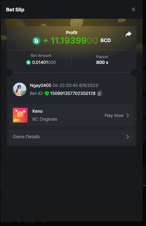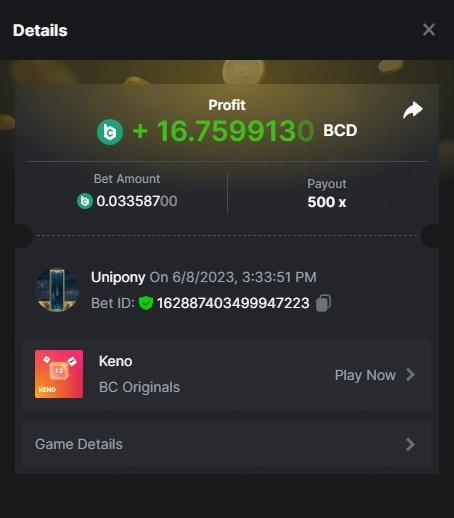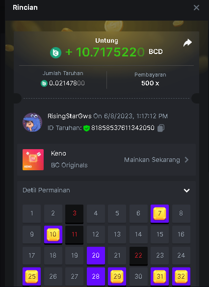 Maksypro Posted June 8, 2023 Share Posted June 8, 2023 Read Carefully Before Start To Hunt Daily Challenges #260 KENO Hunt : Win the highest multiplier Min Multiplier requirement 100x Min Level 4 ๏ธDuration Starting : Now End time : 23.59 UTC Time How to Join? Make screenshot + paste your bet link + UID or Profile link Any coin, with min bet 0.01 USD is allowed (jb/bb/bcl not allowed) Reward Prizes 1st Place.....$7 BCD 2nd Place.....$5 BCD 3rd Place.....$4 BCD 4th Place.....$3 BCD 5th Place.....$2 BCD ๐ต Winners will be announcing next day after Roll Point! 1 Link to comment Share on other sites More sharing options...